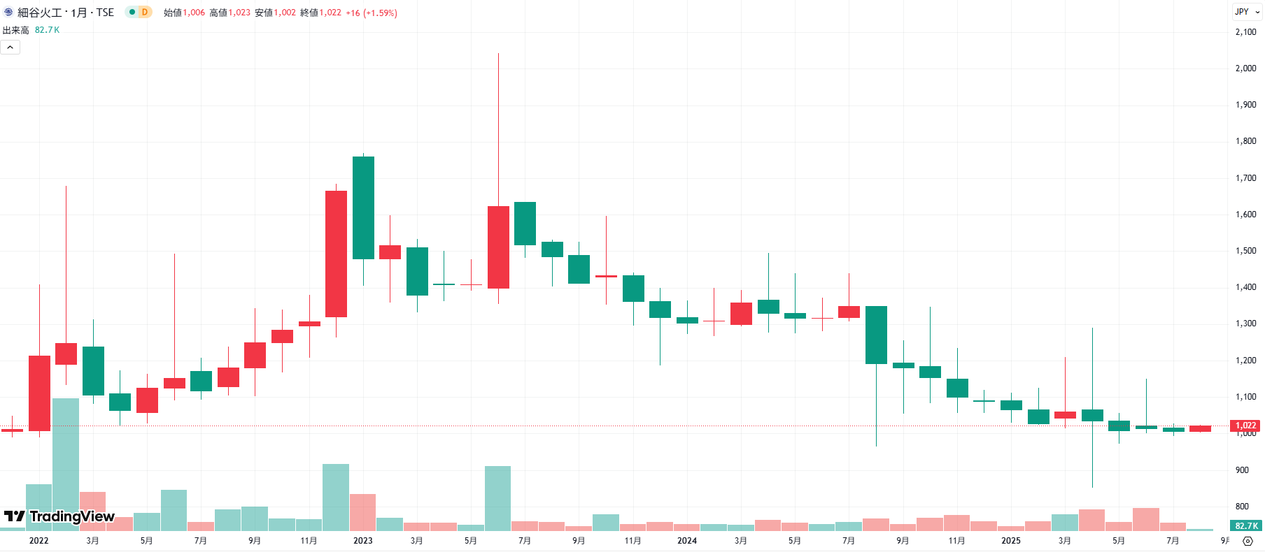 細谷火工は、防衛用途の信号用火工品(煙幕弾・照明弾など)や、ロケット用点火装置などを手がけている、ニッチながらも重要な技術を持つ企業です。民間向け花火の製造でも知られていますが、売上の大部分は防衛省向けです。