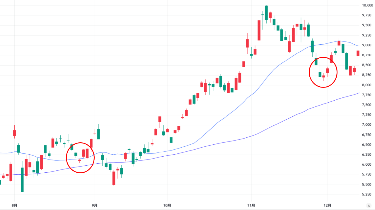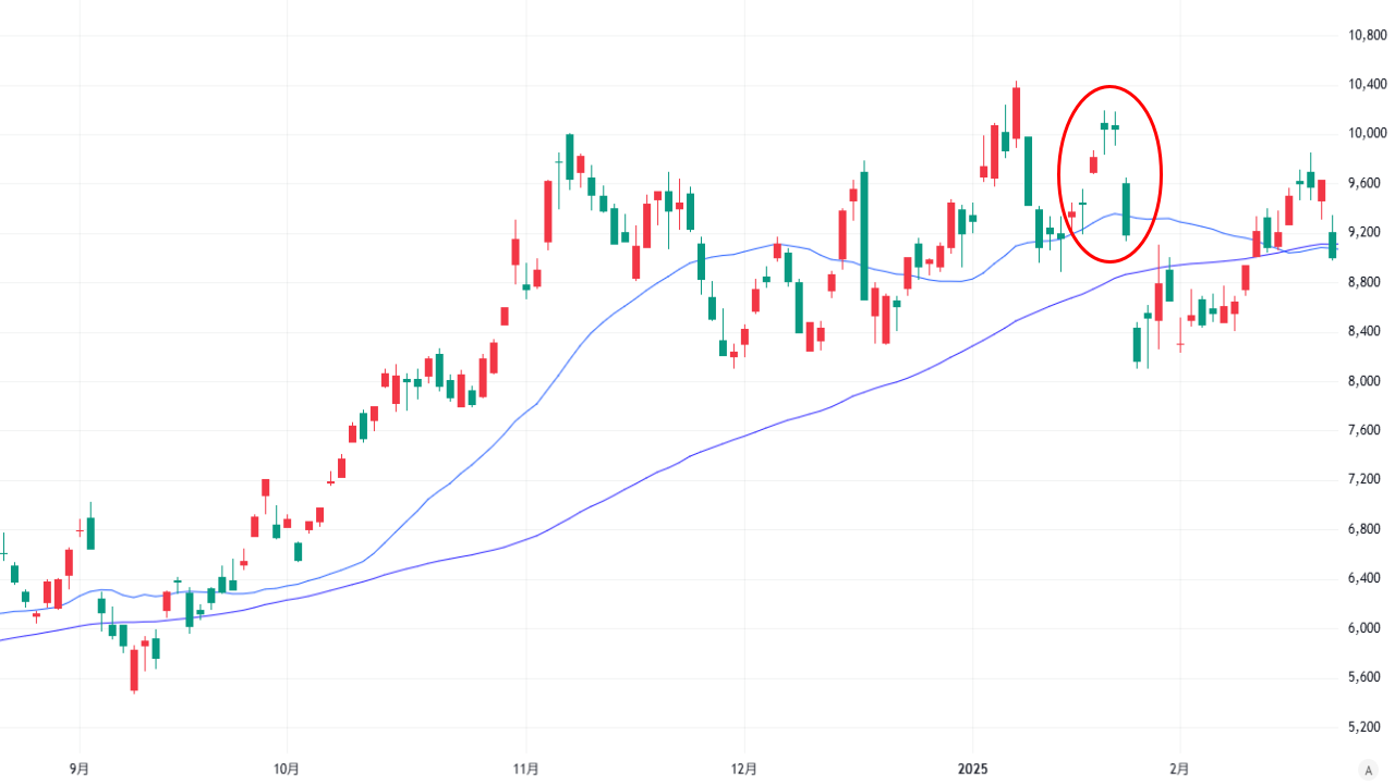 ▼2025年1月にアドバンテストの株価が天井をつけた際には、2本の小さなローソク足が出現しています。