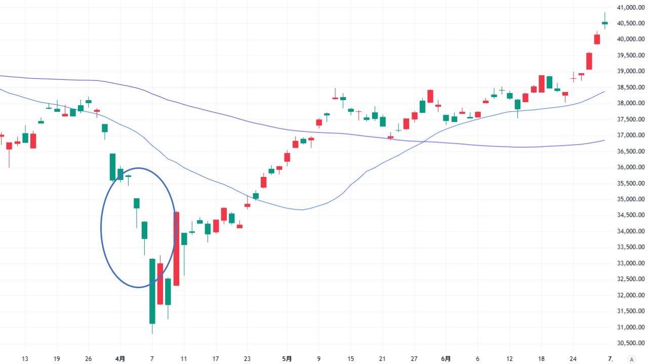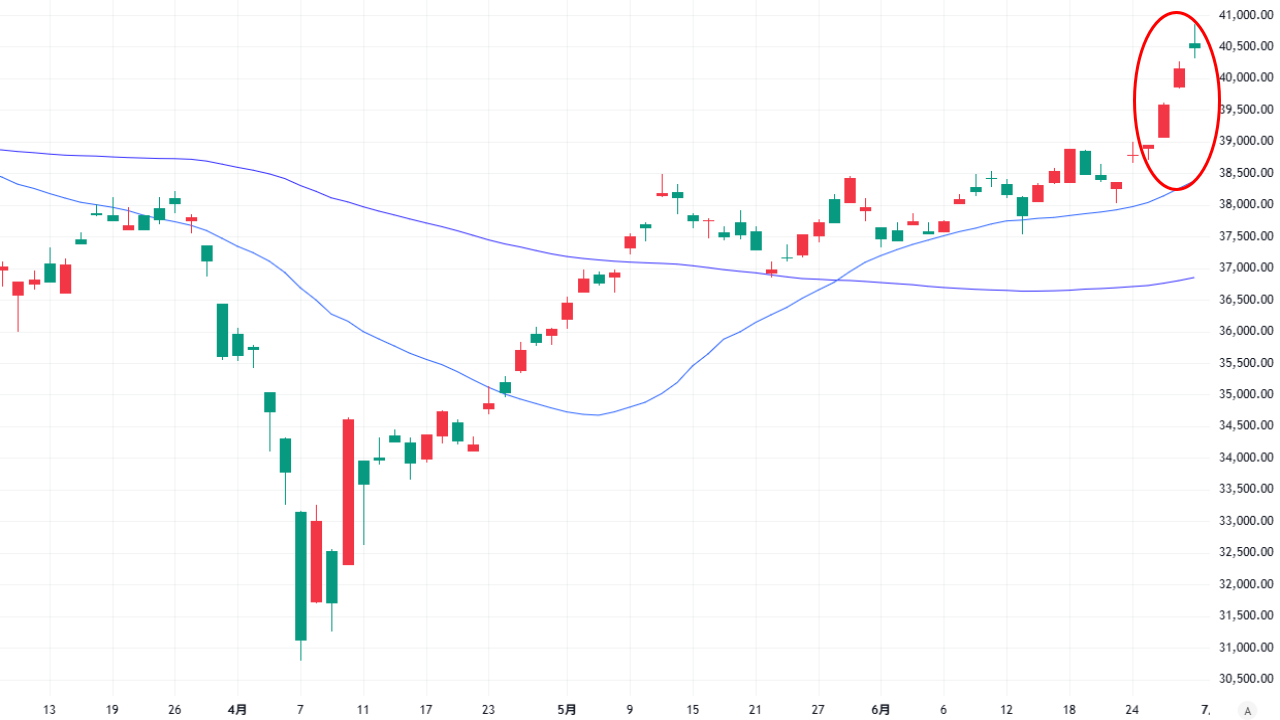 ▼また、2025年6月に日経平均株価が4万円を突破した際には、三空踏み上げが出現しています。