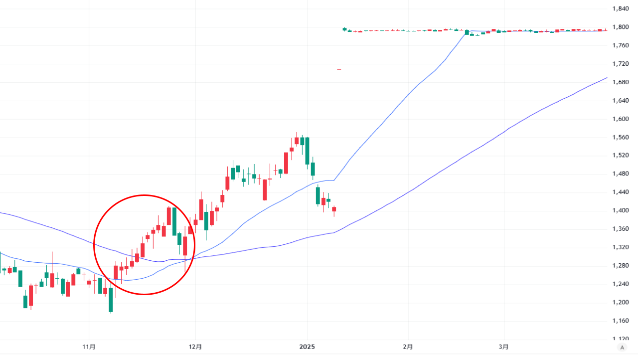 ▼たとえば2024年の11月には、日経平均株価が軟調に推移する中でも、ジャムコという銘柄が連続して陽線をつけていました。