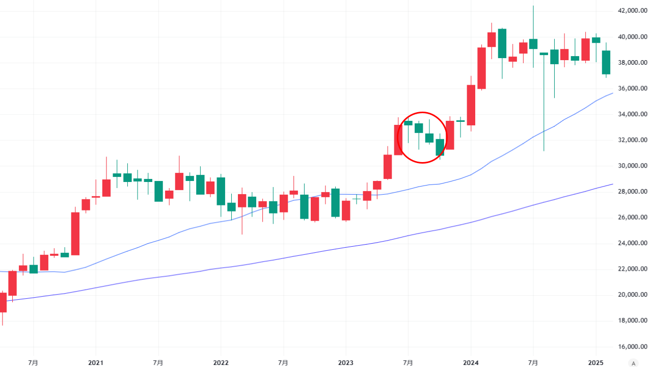 ▼例として、2023年から2024年の日経平均株価の上昇局面を月足で見てみましょう。