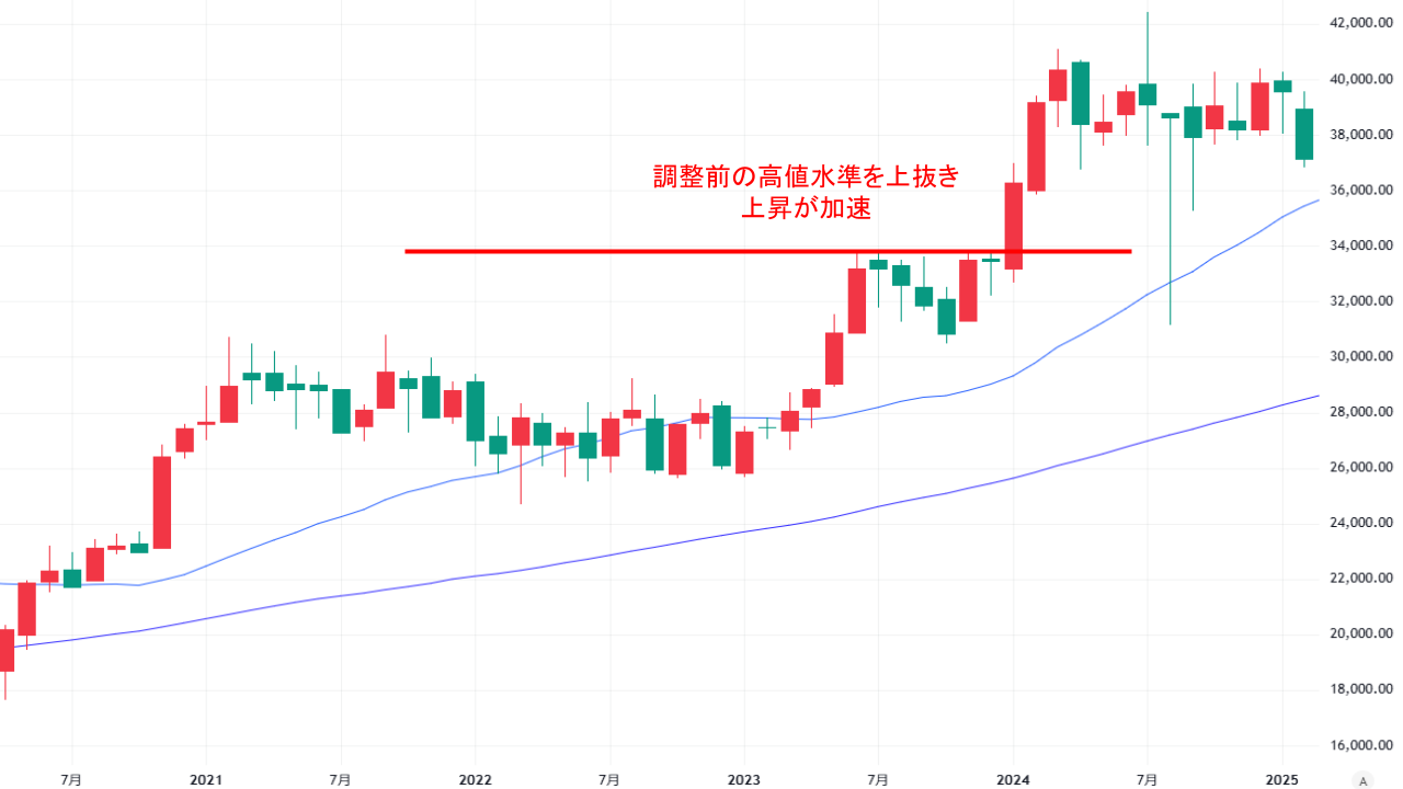 ▼この調整前の高値を2024年1月に上抜いたことが、上昇加速の引き金となりました。