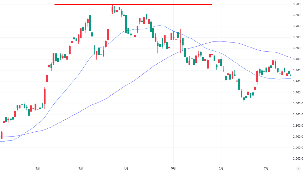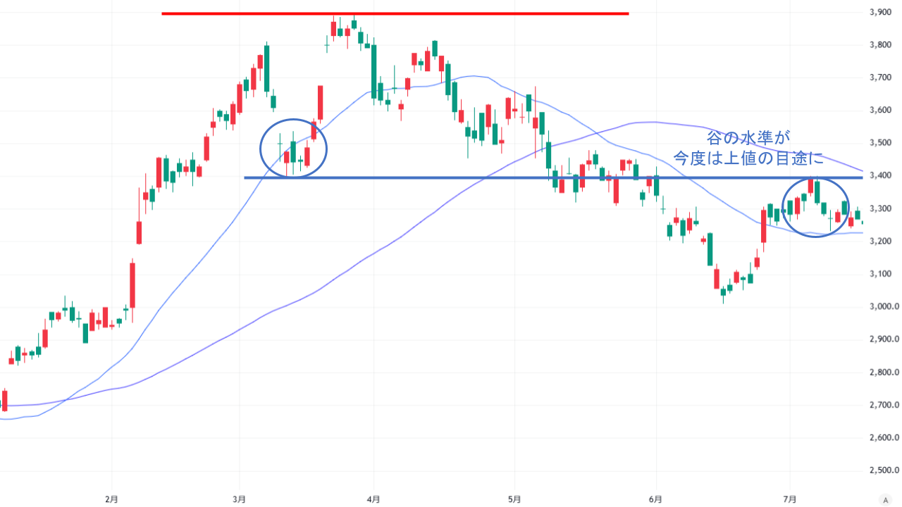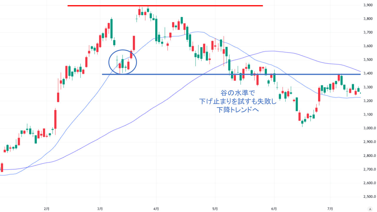 3つの山が投資家に天井を強く意識させ、谷の水準より上値では売りが強まったため、株価が下降トレンドに転じたと分析できます。